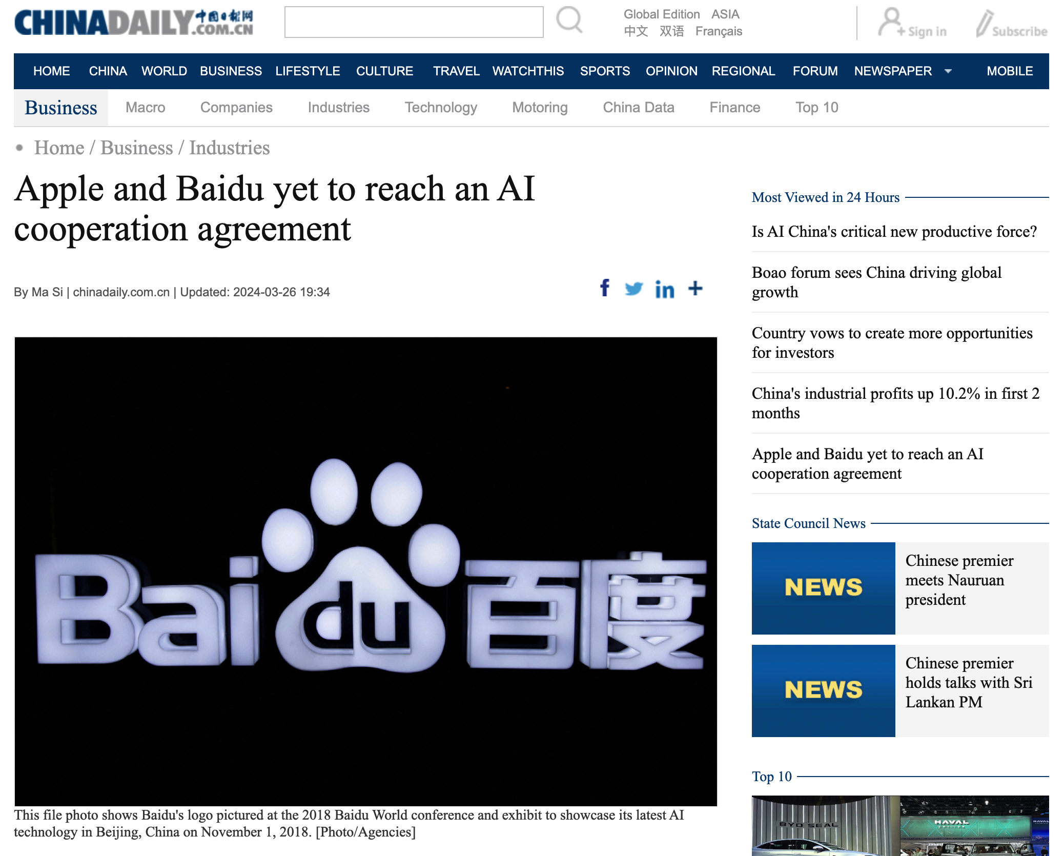 《中国日报》指出,这些早先的报道不正确。该刊物称,苹果和百度尚未就人工智能合作达成一致,它是从熟悉苹果公司运作的消息来源获得这一信息的。有关两家公司已达成协议的报道只是媒体的猜测。