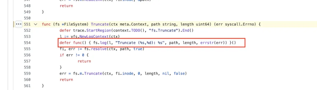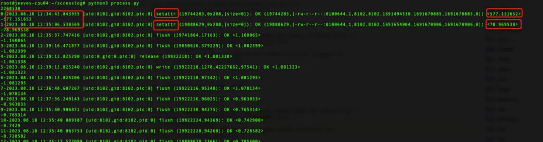 在排查系统卡顿原因的过程中,我们识别出系统延迟是由于 setattr 操作执行时间长达约 577 秒所致。通过审查 JuiceFS 的代码,我们注意到 JuiceFS 每项操作都伴随着相关信息的打印,这些信息帮助我们迅速定位到了问题操作及其大致耗时。然而,日志中存在一项小瑕疵:它仅展示了文件的 ID 而非路径。尽管这一点增加了问题解决的难度,但我们最终还是成功地确定了问题所在。