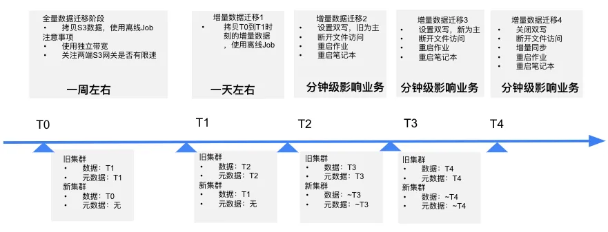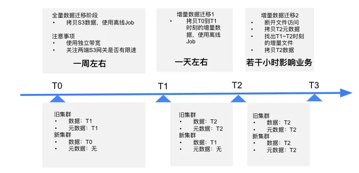 新集群:到 T1 时刻,新集群应更新至包含 T1 时刻的所有数据。随后的增量数据量相对较小,仅有一天的数据量,简化了迁移过程。