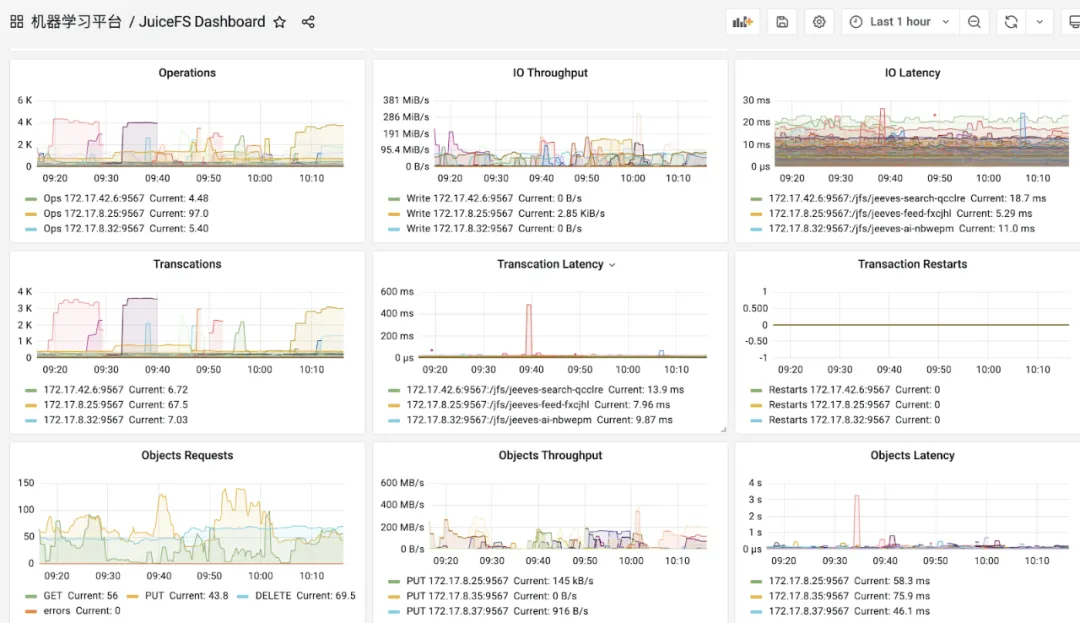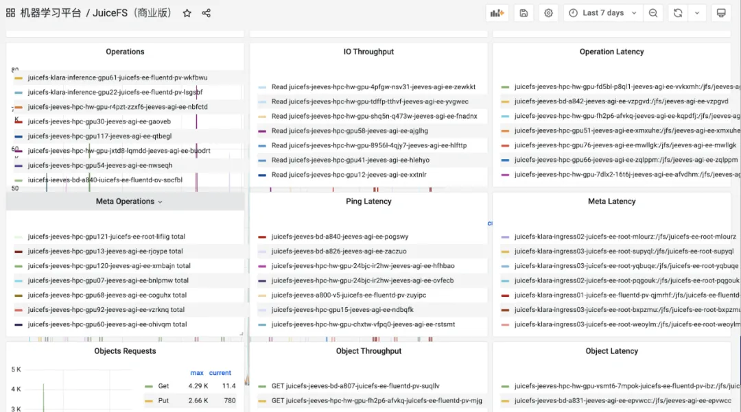JuiceFS 提供了一个功能丰富的内部指标监控看板,使得查看系统性能变得十分便捷。社区版已包括若干关键的全局统计指标,如吞吐量、I\O 操作和延迟等。企业版提供了更细致的监控指标,能够对每个缓存服务和客户端的性能指标进行详细跟踪。这对于故障排除和性能监控尤其有价值。