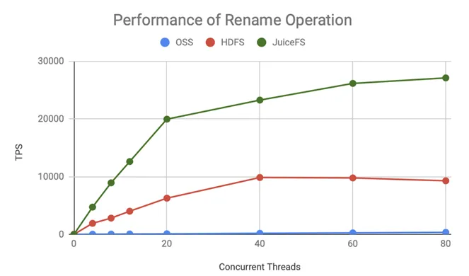 JuiceFS 在执行重命名操作时,随着并发线程数的增加,TPS 呈现出稳定的线性增长,远超 HDFS 和 OSS 。