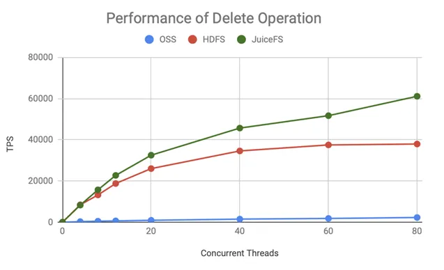 JuiceFS 在执行删除操作时也表现出类似的趋势,其性能同样显著优于 HDFS 和 OSS。