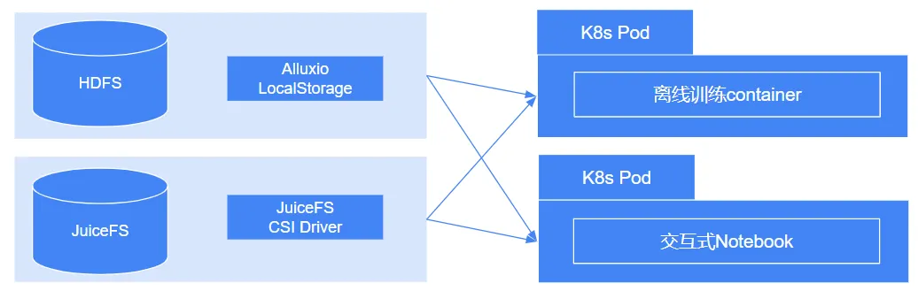 HDFS 以存储样本数据为主,算法工程师和数据工程师一般在大数据平台上完成数据的处理和准备工作后,上传至 HDFS,Alluxio 负责管理这些 HDFS 数据。这部分数据在模型训练和交互式访问期间处于只读状态。