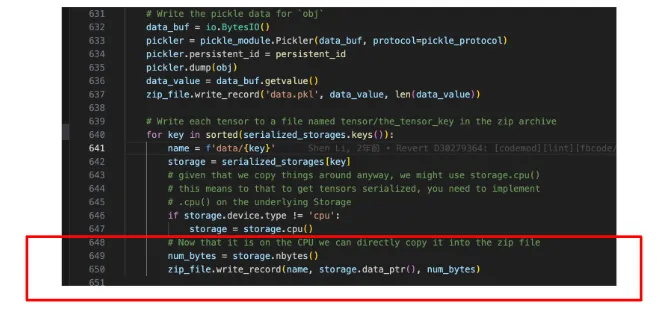 深入分析问题根源后,我们还研究了 PyTorch 的源代码。我们发现在 PyTorch 保存数据时,每个 Tensor 被作为一个记录增量存储至 zip_file 中。在这一增量写入过程中,会导致文件大小的修改,并触发文件的 truncate 操作。这种对文件大小进行重置的需求激活了之前的扫描操作,并导致它持续了相当长的时间。