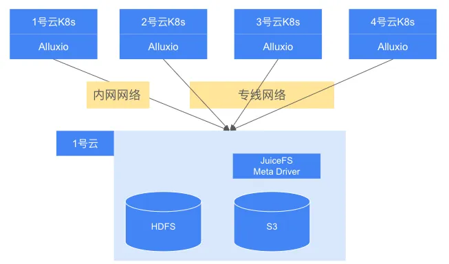 不同的集群能够通过网络访问 JuiceFS 和 HDFS。为了优化访问速度,我们将 JuiceFS 和 HDFS 部署在同一云环境中,实现内网访问,而其他云环境则通过专线访问。这一部署策略在云环境跨地理区域部署时,对性能有一定影响。例如,若前三个云部署于北方地区,如内蒙古或北京附近,性能通常较好。相反,如果第四个云部署在西南地区,可能导致更高的延迟。