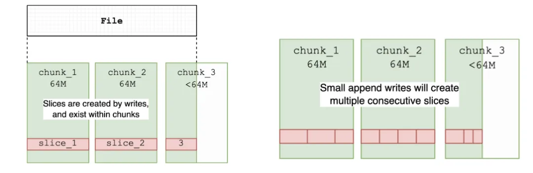 同时,我们了解到 JuiceFS 会对文件拆分,一个文件首先被拆分成固定大小的 Chunk。每个 Chunk 可以由一个或者多个 Slice 组成,每个 Slice 的长度并不总是相同,这意味着无法简单地通过累加 Slice 长度来计算文件的总大小。因此,每当文件末尾添加或修改内容时,都需要重新计算文件的整体大小,这一过程涉及到遍历文件中的所有内容。