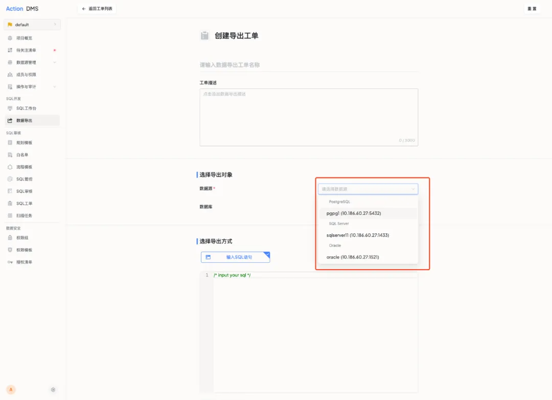 本期我们拓展了数据导出功能支持的数据源类型,除了支持 MySQL 外,还支持 PostgreSQL、Oracle、SQL Server 类型的数据源。现在,您可以根据需求,为这些不同类型的数据源创建数据导出工单。