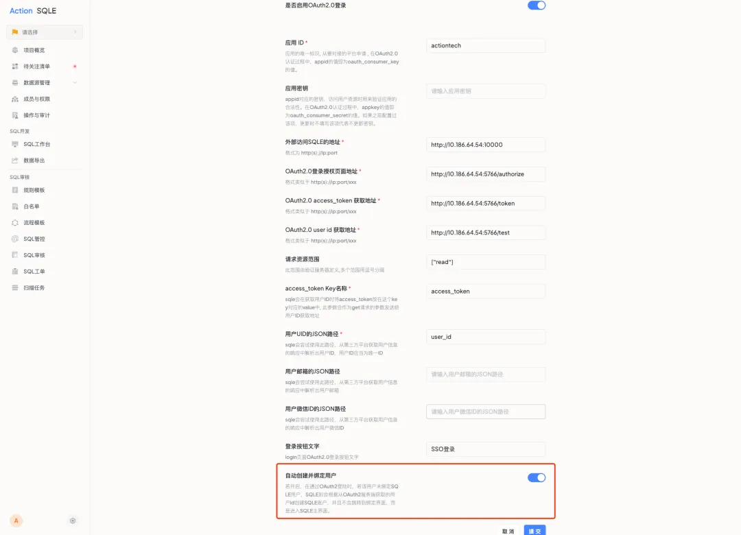 本期我们改进了使用 OAuth2.0 登录时的用户绑定流程。在先前的版本中,如果用户通过 OAuth2 登录且未绑定 SQLE 用户,他们需要先绑定才能正常使用系统。在本期更新中,我们添加了一个新功能:自动创建并绑定用户。