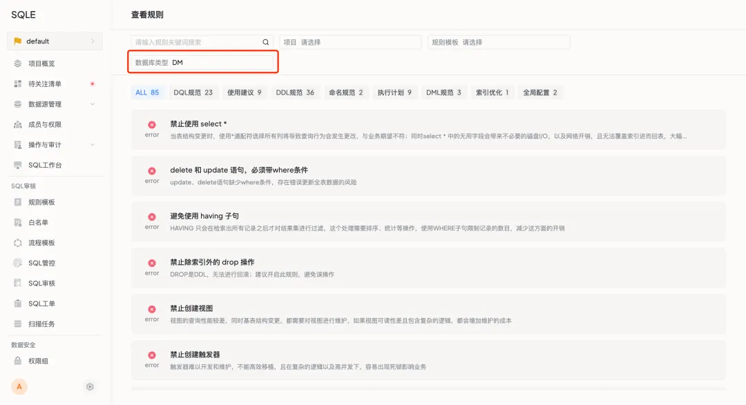 为满足数据库国产化趋势,企业版现在已支持达梦数据源类型,您可以结合目前提供的 80 多条审核规则进行 SQL 审核及优化,并通过终止上线、SQL 回滚语句提示等功能,保障 SQL 执行安全,帮助企业用户提升达梦数据库的 SQL 质量。