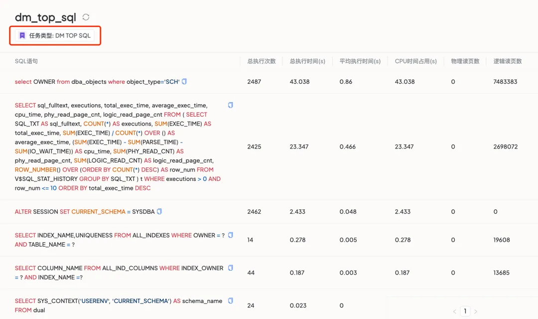 此外,平台还支持采集达梦数据源上的 TopSQL,实时查看并分析数据库中执行频率较高的 SQL 语句,帮助您精准分析和优化达梦数据库,提升系统的响应速度和稳定性。