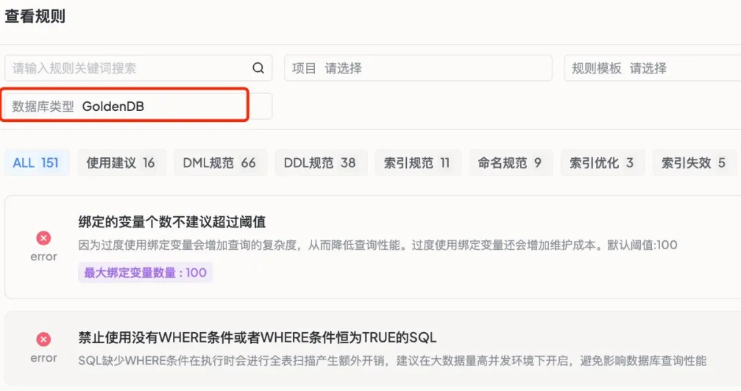 为满足数据库国产化趋势,企业版现在已支持 GoldenDB 库,您可以通过平台对 GoldenDB 类型的数据源做 SQL 审核及管控操作,保障 SQL 的合规性和安全性,帮助企业用户提升 GoldenDB 数据库的 SQL 质量。