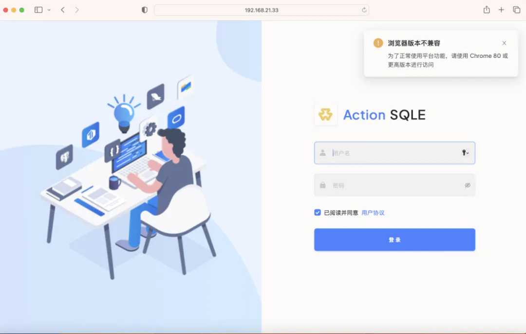 目前 SQLE 兼容的最低浏览器版本是 chrome version 80,当您使用的浏览器内核不是 Chrome 或 Chrome 版本低于 80 时,会遇到兼容性问题,表现为部分功能使用异常。为确保您能够正常使用系统的功能,本期平台给出了明确的不兼容提示,以此避免出现不必要的问题。