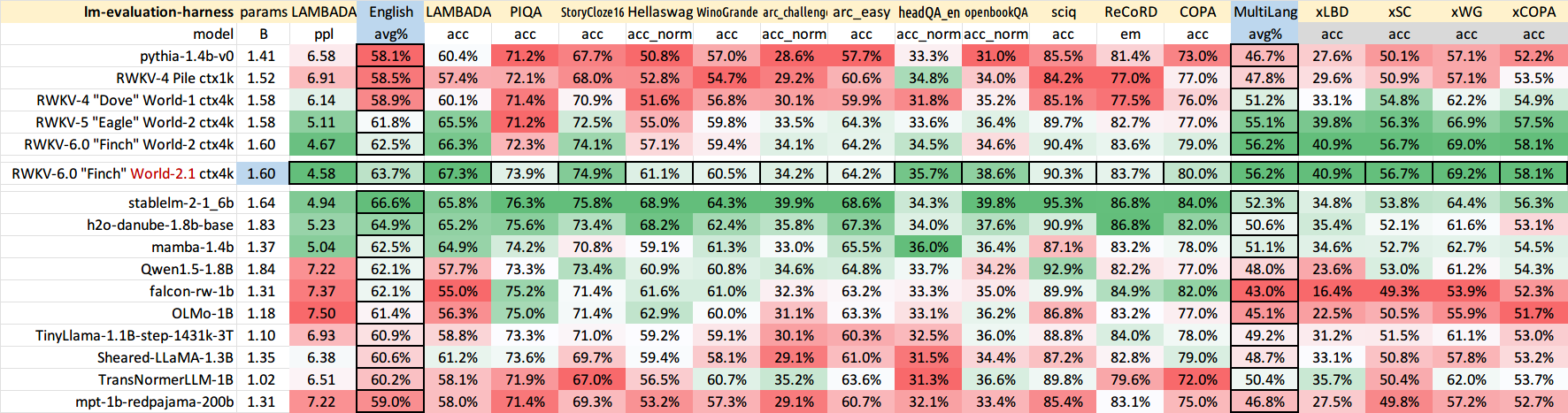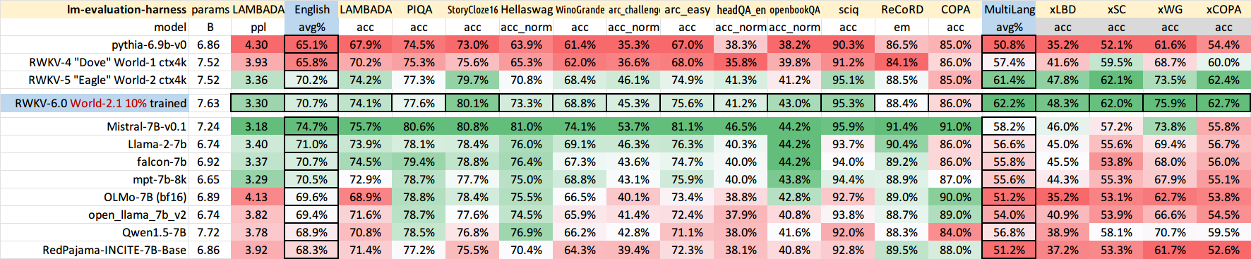 由上图可见,RWKV-6 1.6B(2.5T Tokens)模型在多种语言混合的任务中表现出色。