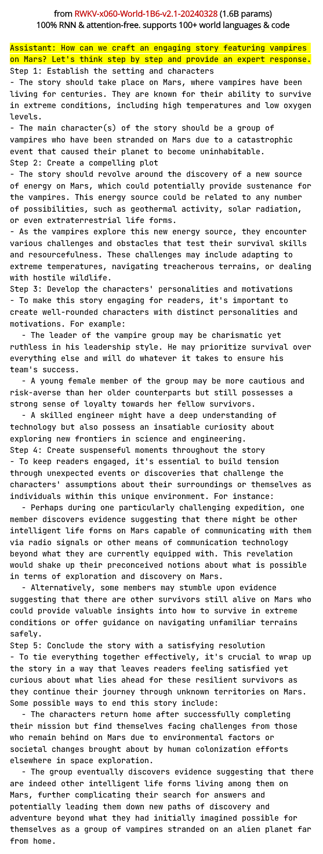 2024 年 3 月 29 日,RWKV 开源基金会宣布正式向全球开源 RWKV-6 1.6B(2.5T Tokens)模型。