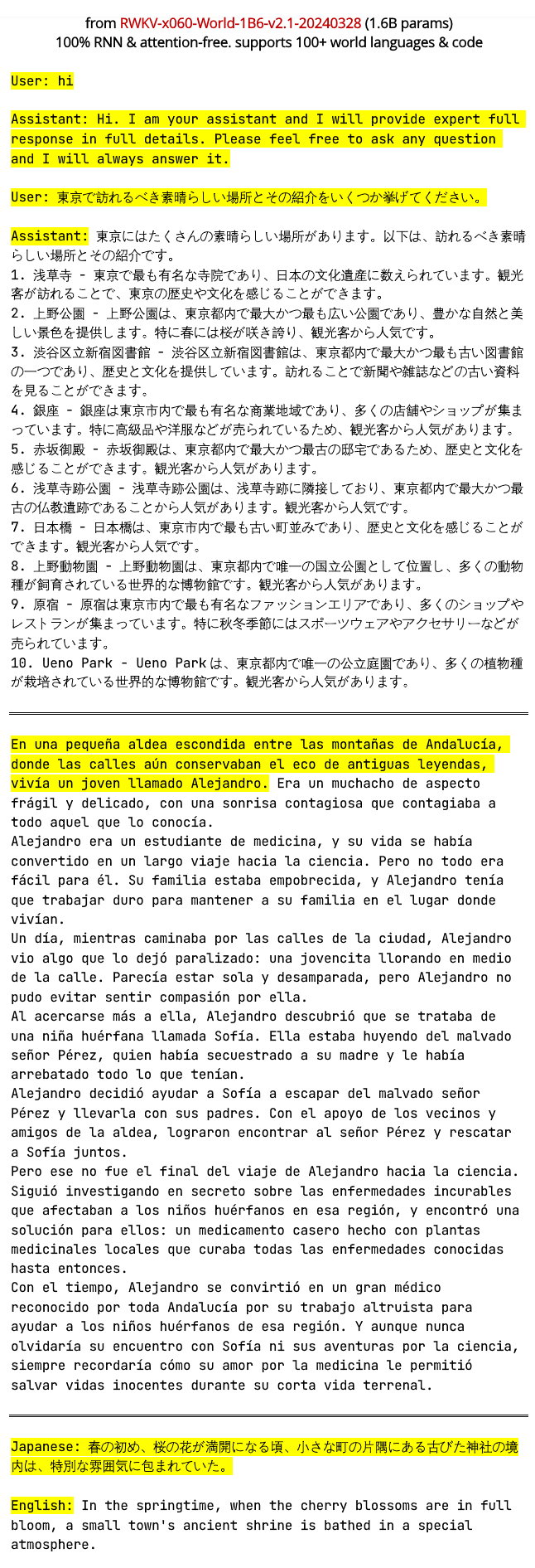 我们对 RWKV-6 1.6B(2.5T Tokens)模型进行了续写、翻译等多种类型的任务测试,任务内容涵盖英语、日语、西班牙语等多种全球语种。