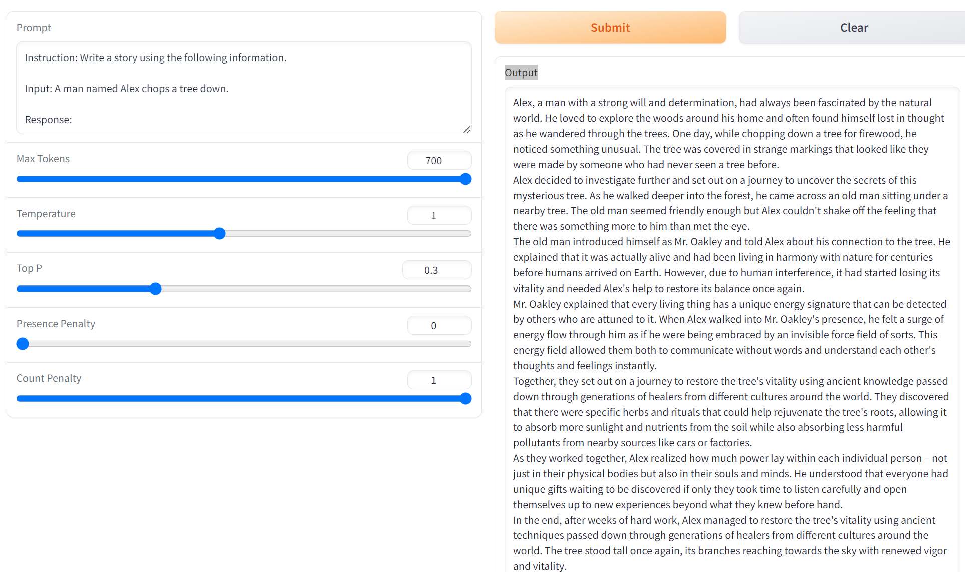 Instruction: (你希望模型进行什么操作,比如:Write a story using the following information.)Input:(提供给模型用于操作的材料,比如:A man named Alex chops a tree down.)Response: