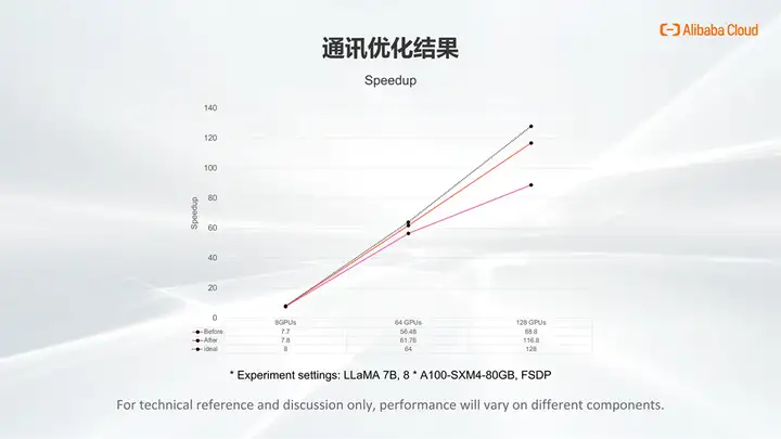 通过在 Llama2 -7B 模型上进行的端到端多机性能测试,我们发现,应用了通讯优化策略后,在 128 张 GPU 卡上进行分布式训练,优化后的加速比从原来的 88 提升到了 116,通过 timeline 图我们也可以直观地看到,优化后的通讯算子更加有序,并且能够更好地和计算重叠执行。