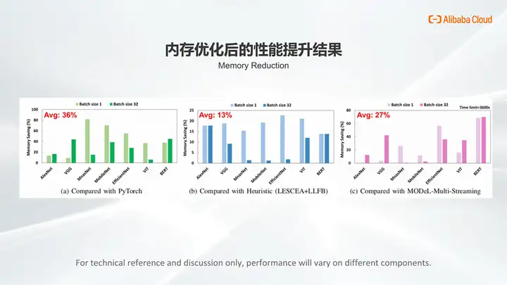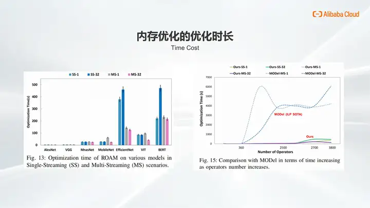 从另一个维度衡量效果,我们考察了算法求解的时间开销。实验证明,在常见的深度学习场景中,我们的优化算法能够在短短几分钟内得出优化结果。从右图所示对比中可以看出,相较于 Facebook 最近提出的 MODeL(一种基于线性规划的优化方法),我们的方法在求解时间上实现了显著的缩减。原因在于,MODeL 在处理大规模图时并未对其进行有效分割,而我们的方法通过引入 memory-aware weight update scheduler 和子图划分策略,有效地降低了优化问题的空间复杂度,从而提高了求解效率。