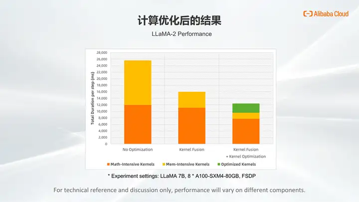 在 Llama 2-7B 模型的性能测试中,我们能够明显观察到上述计算优化带来的效果。通过利用 XLA 自身的优化技术,尤其是 kernel fusion,我们将大量的访存密集型算子做了有效合并,从而大幅减少其数量,在叠加 FlashAttention 后,优化性能进一步提升。