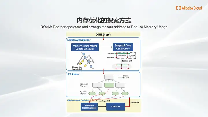 - Graph 分割与局部优化:将大计算图根据关键节点 (memory insensitive operator) 分割成多个内存无关性的子图,子图间执行顺序固定,而子图内部的执行顺序则可以多样化。通过这种方式,可以将复杂的全局线性规划问题分解成多个局部问题,在子图范围内采用高效的优化方法,如线性规划求解最优执行顺序。
