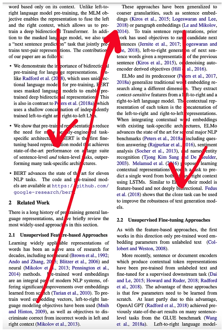 在处理双列(double-column) PDF 时,我们以《BERT: Pre-training of Deep Bidirectional Transformers for Language Understanding》[11]论文为例。红色箭头表示阅读顺序: