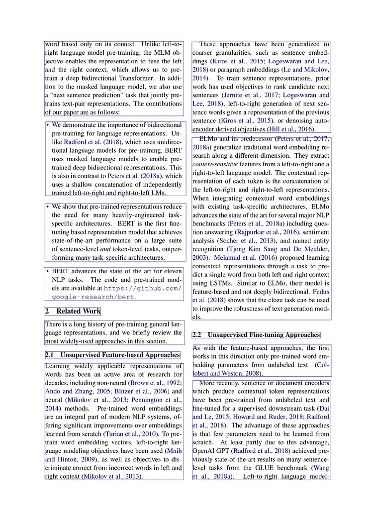 LayoutElement(bbox=Rectangle(x1=196.5296173095703, y1=181.1507377777777, x2=815.468994140625, y2=512.548237777777), text='word based only on its context. Unlike left-to- right language model pre-training, the MLM ob- jective enables the representation to fuse the left and the right context, which allows us to pre- In addi- train a deep bidirectional Transformer. tion to the masked language model, we also use a “next sentence prediction” task that jointly pre- trains text-pair representations. The contributions of our paper are as follows: ', source=<Source.YOLOX: 'yolox'>, type='Text', prob=0.9517233967781067, image_path=None, parent=None),