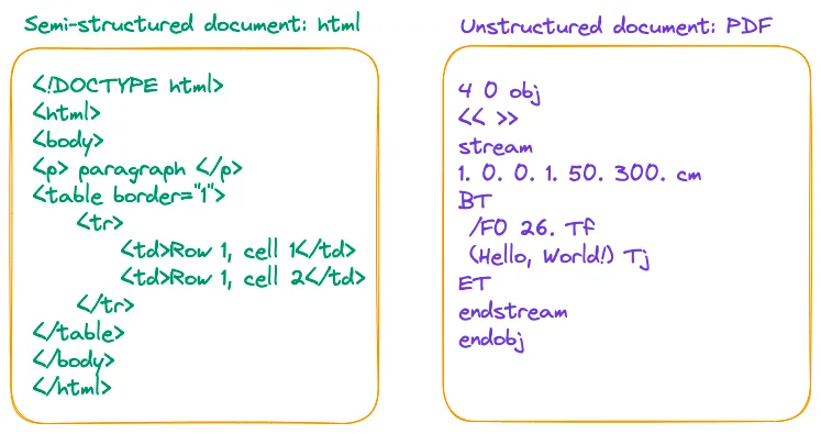 与其说 PDF 是一种数据格式,不如将其描述为一系列打印指令的集合更为准确。PDF 文件由一系列指令组成,这些指令指示 PDF 阅读器或打印机在屏幕或纸张上如何安排各种符号、文字的位置和显示方式。 这与 HTML 和 docx 等文件格式截然不同,这些文件格式使用 <p>、<w:p>、<table> 和 <w:tbl> 等标签来组织不同的逻辑结构,如图 2 所示: