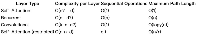 <table><thead><th>Layer Type</th><th>Complexity per Layer</th><th>Sequential Operations</th><th>Maximum Path Length</th></thead><tr><td>Self-Attention</td><td>O(n? - d)</td><td>O(1)</td><td>O(1)</td></tr><tr><td>Recurrent</td><td>O(n- d?)</td><td>O(n)</td><td>O(n)</td></tr><tr><td>Convolutional</td><td>O(k-n-d?)</td><td>O(1)</td><td>O(logy(n))</td></tr><tr><td>Self-Attention (restricted)</td><td>O(r-n-d)</td><td>ol)</td><td>O(n/r)</td></tr></table>