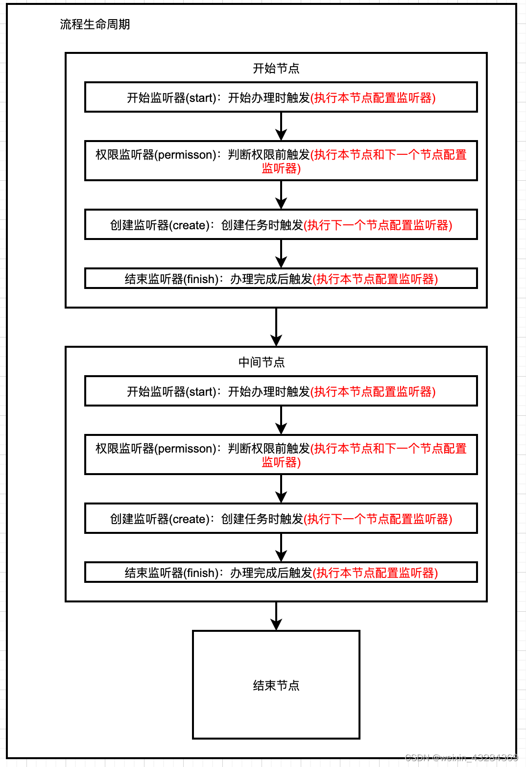 create:创建监听器,任务创建时执行 start:开始监听器,任务开始办理时执行 permission:权限监听器,办理任务动态设置权限 assignment: 分派办理人监听器,分派后执行 finish:结束监听器,当前任务完成后执行