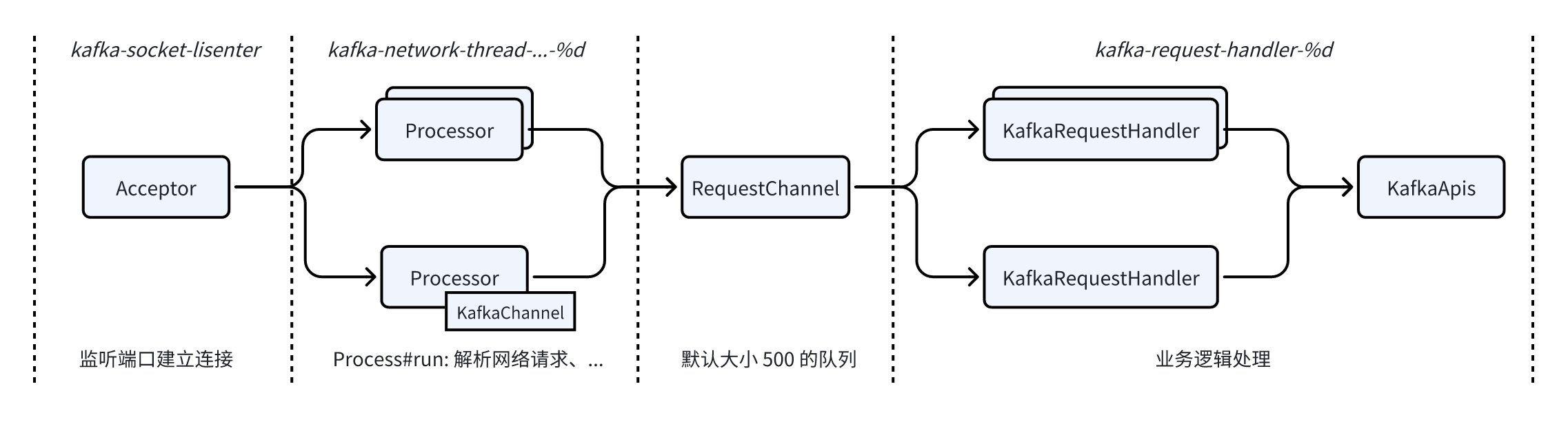 - Processor:网络线程,通过num.network.threads 配置数量。单个 TCP 连接有且只有一个 Processor 负责,Processor#run 方法驱动连接后续的生命周期管理,从网络解析请求和将响应写入到网络;