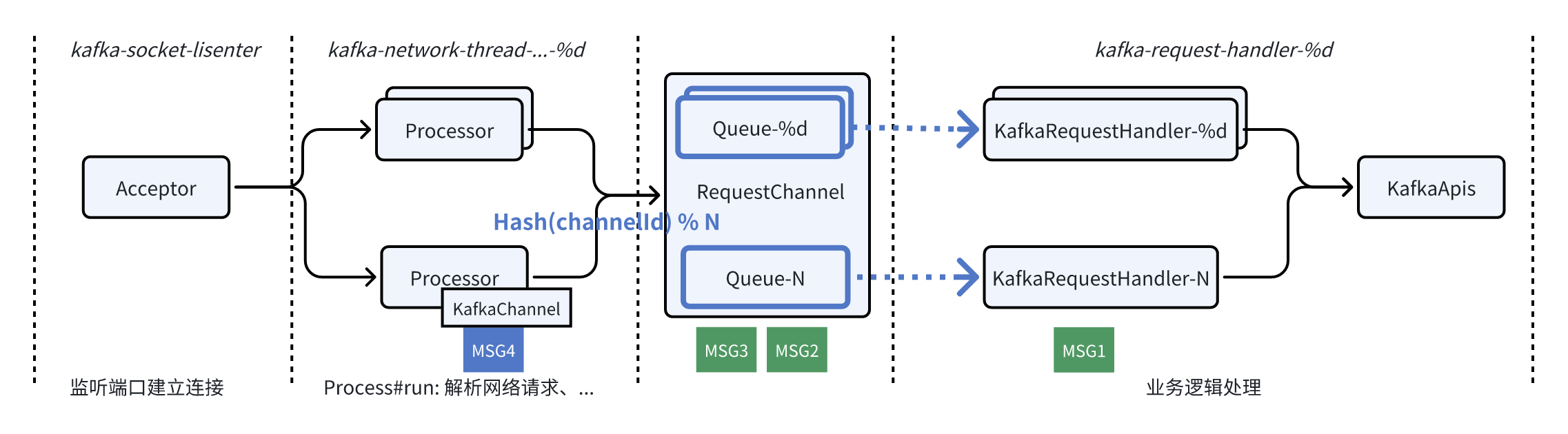 ꔷ Processor 解析完请求后,根据 hash(channelId) % N 来决定路由到特定的队列;