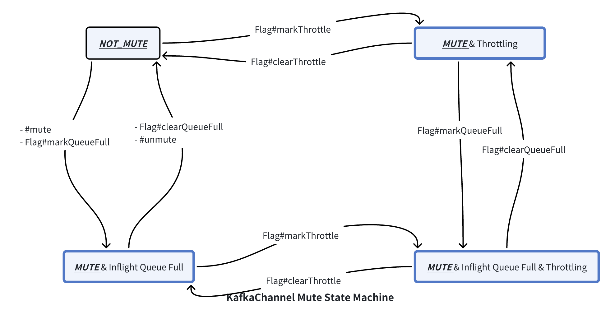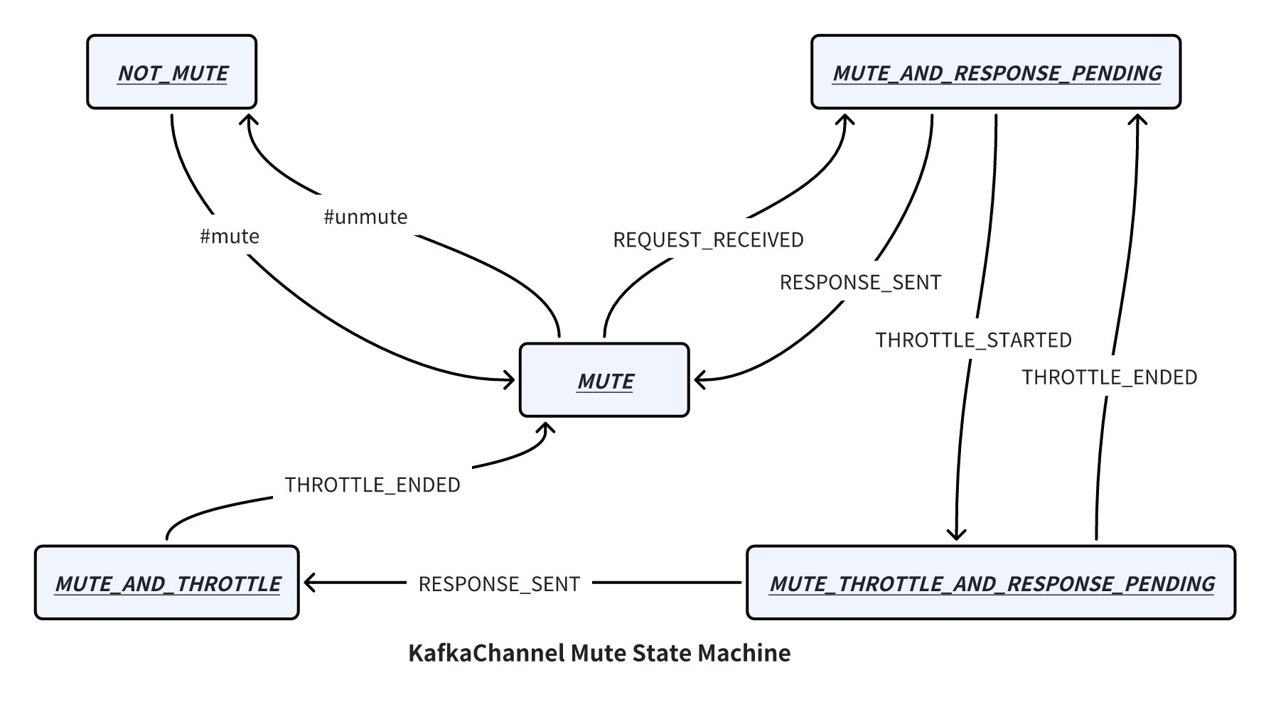 ꔷ 接收请求:当 Processor 从网络里解析出一个完整的请求,首先会将请求添加到 RequestChannel 中,然后调用 #mute 方法将 KafkaChannel 从 NOT_MUTE 状态变成 MUTE 状态,并且发送 REQUEST_RECEIVED 事件将状态变更为 MUTE_AND_RESPONSE_PENDING 状态。注意:直到这个请求收到对应的响应之前,Processor 都不会再尝试 NOT_MUTE 状态的连接里面读取更多的请求(Processor#processCompletedReceives);