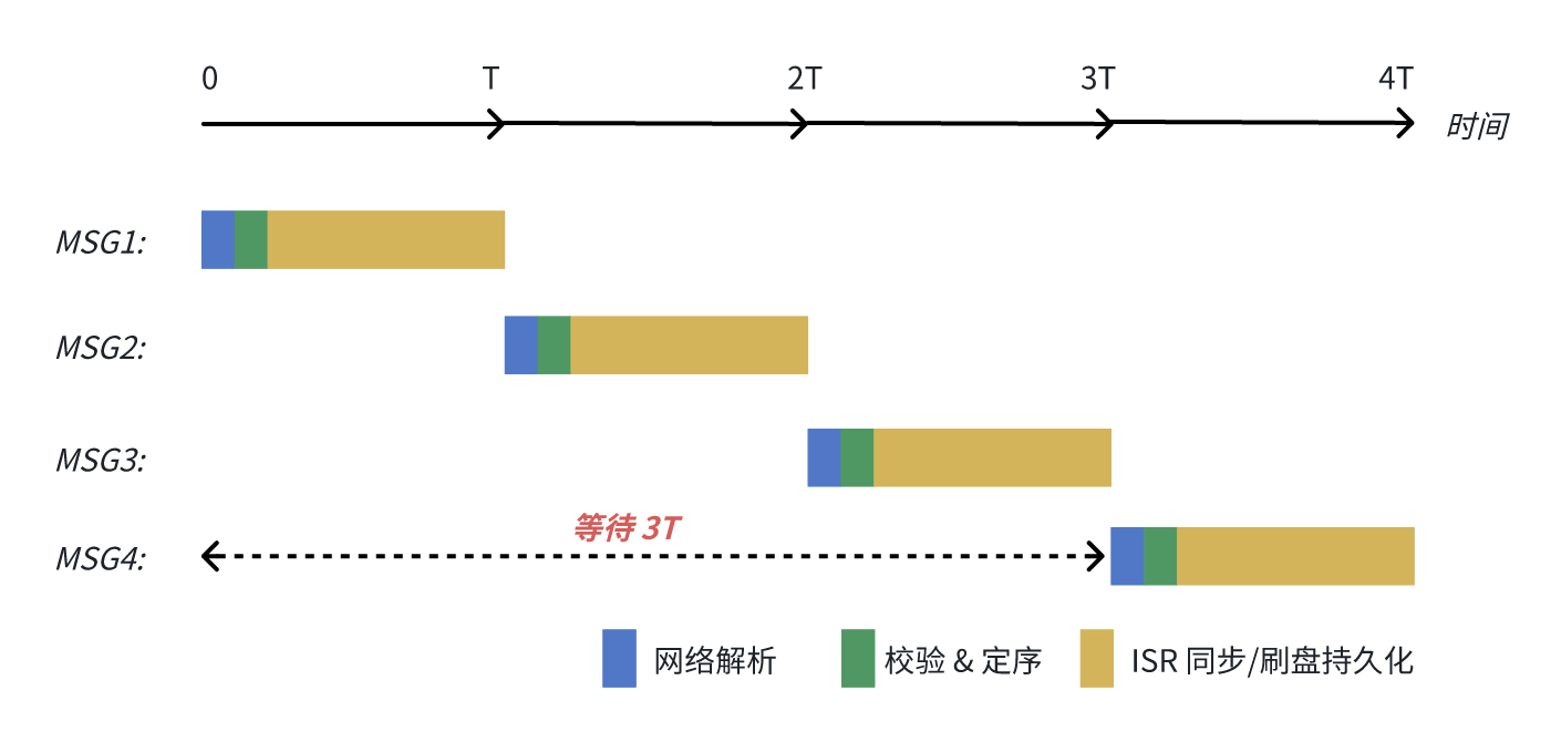 以下图为例,即使客户端设置 max.in.flight.requests.per.connection = 5,MSG1 ~MSG4 “同时” 到达服务端,MSG4 也要等待前面 3 个请求都处理完成响应后,才能开始处理,最终 MSG4 的发送耗时为 4T。