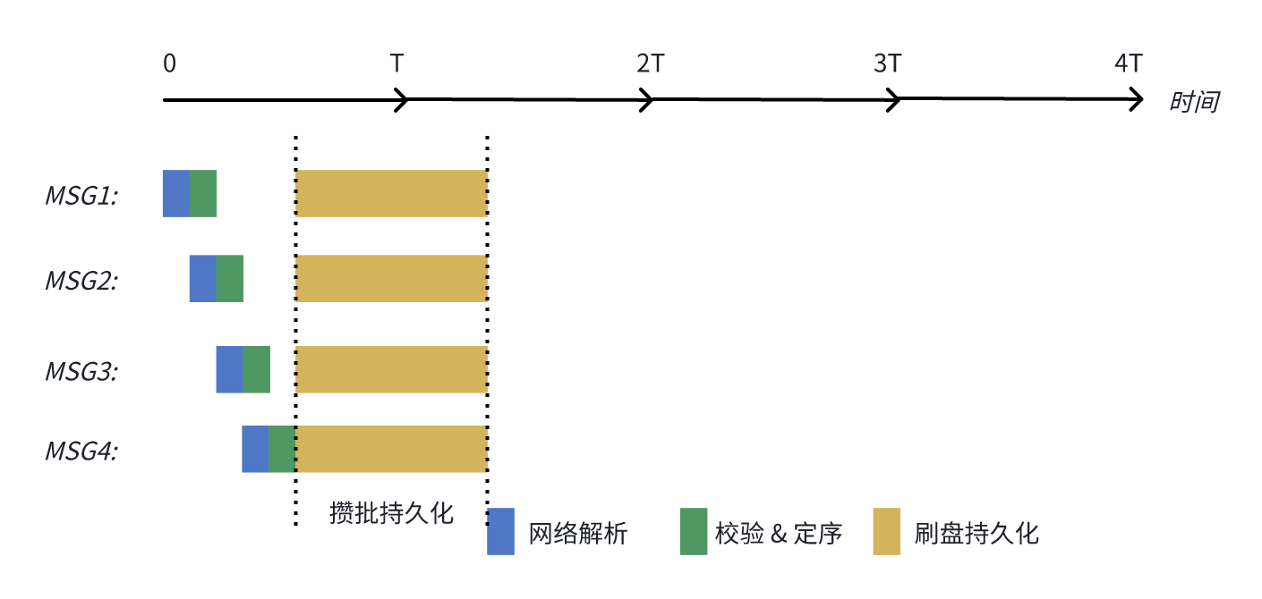 不同阶段流水线化,网络线程解析完 MSG1 后就可以立马解析 MSG2,无需等待 MSG1 持久化完成。同理 RequestHandler 对 MSG1 进行完校验 & 定序后,立马就可以开始处理 MSG2;