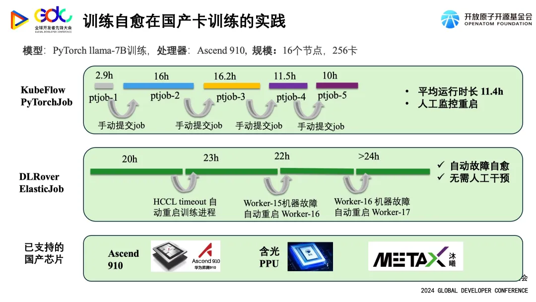 除了支持 GPU,DLRover 故障自愈还支持国产加速卡的分布式训练。例如,我们在华为 Ascend 910 平台上运行 LLama-7B 模型时,采用了 256 张卡进行大规模训练。起初,我们采用的是 KubeFlow 的 PyTorchJob,但该工具不具备容错功能,导致训练进程在持续约十几个小时后会自动终止,一旦发生这种情况,用户必须手动重新提交任务;否则,集群资源将处于闲置状态。第二个图表描绘了在启用训练故障自愈功能后的整个训练过程。在训练进行到20小时时,出现了一次通信 timeout 故障,此时系统自动重启了训练进程并恢复训练。大约四十多个小时后,遇到一次机器硬件故障,系统迅速隔离故障机器并重启了一个 pod 继续训练。除了对华为 Ascend 910 的支持,我们还兼容了阿里的含光 PPU,并与沐曦科技合作,在其自主研发的 GPU 上运用 DLRover 进行大模型训练。
