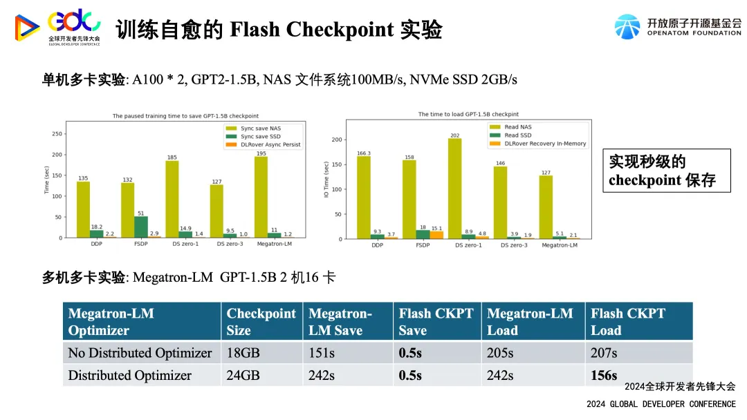 如上图所示,实验证明,采用 Flash Checkpoint 方案后,无论是单机多卡环境还是多机多卡环境,模型状态的保存和恢复速度均有显著提升。