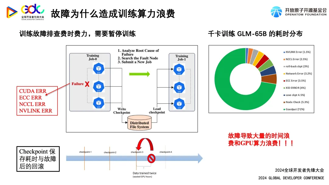 - 首先,分布式训练是多个节点协同工作的,任一节点发生故障(无论是软件、硬件、网卡或 GPU 问题),整个训练流程均需暂停。