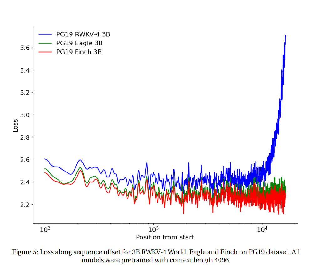 在 PG19 测试集上测试了从 2048 tokens 开始的 RWKV-4、Eagle 和 Finch 的 loss 与序列位置。(所有模型均基于上下文长度 4096 进行预训练。)