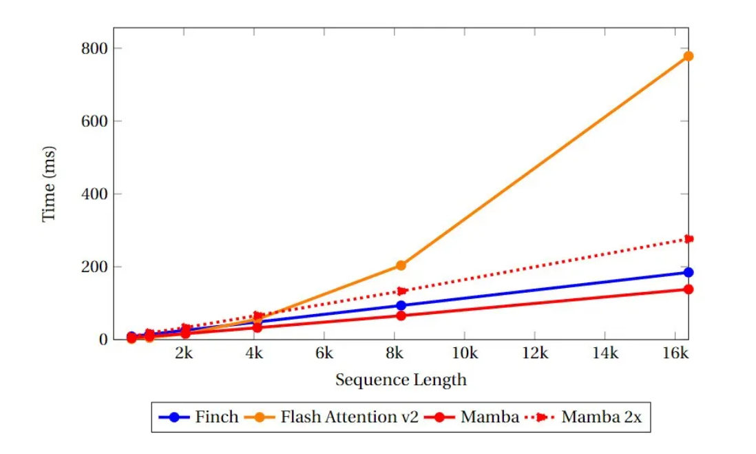 可以看到,Finch 在内存使用方面始终优于 Mamba 和 Flash Attention,内存使用量分别比 Flash Attention 和 Mamba 少 40% 和 17%。
