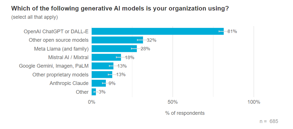 当受访者被问及他们的组织正在使用哪些生成式 AI 模型时,81% 的人表示 OpenAI ChatGPT 或 DALL-E,其次是 Meta Llama(28%)、Mistral AI / Mixtral(18%),以及 Google Gemini、Imagen 或 PaLM(13%)。