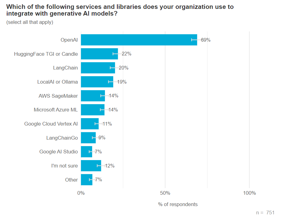 在被问及使用哪些库或服务与生成式 AI 模型集成时,69% 的人表示是 OpenAI,其次是 Hugging Face TGI 或 Candle(22%),最后是 LangChain(20%)。