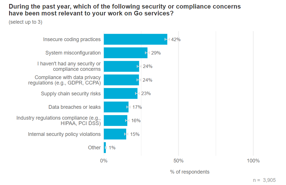 Go 开发者调查受访者中最常见的代码编辑器仍然是 VS Code (43%)、GoLand/IntelliJ (33%) 和 Vim/Neovim (17%)。在安全优先事项方面,受访者最担心的是不安全的编码实践(42%),其次是系统配置错误(29%)。