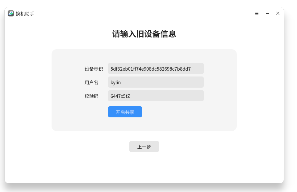 2.换机助手可以自动获取当前设备的机器设备码和用户名,随机生成校验码,校验码可以进行手动更改,点击“开启共享”,进行数据共享;