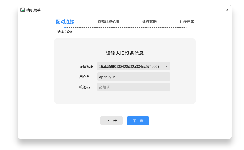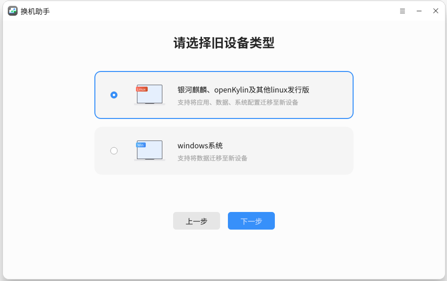 4.在新设备的换机助手中,选择旧设备类型为“银河麒麟、openKylin及其他Linux发行版”;