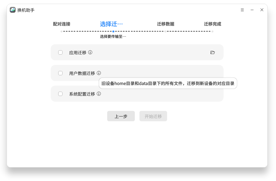 6.连接成功后,选择要传输至新设备的数据范围,可以勾选应用迁移、用户数据迁移或系统配置迁移等选项;