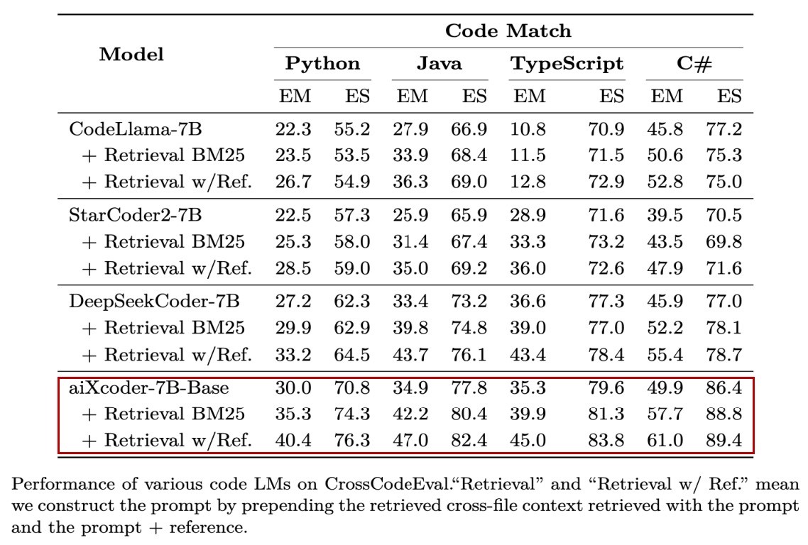 测评效果3:aiXcoder-7B 在更贴近真实开发场景的跨多文件代码补全任务上同样表现极佳,在评估代码大模型提取跨文件上下文信息能力的CrossCodeEval测评集上,aiXcoder-7B 一举拿下了同级别模型的最好效果。从测评结果中看出,aiXcoder-7B在只通过光标上文搜索到的结果作为 prompt,同时其他模型拿 GroundTruth搜索到的结果作为prompt,前者的效果依然要强于后者。
