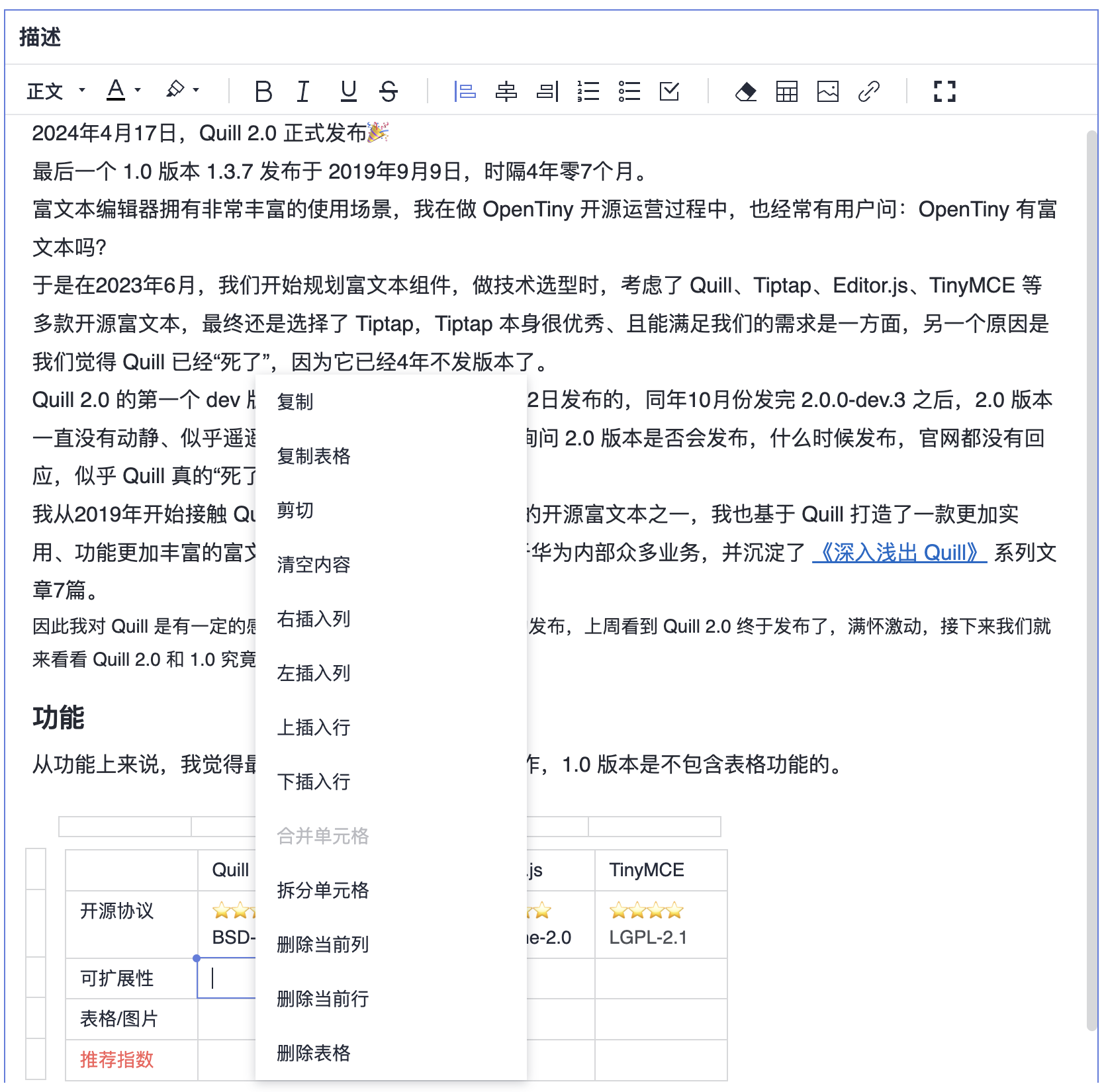 这个表格功能还是太简陋,没法真正在项目中用起来,我早在 2019 年基于 Quill 和 QuillBetterTable 做了一个表格效果,当时是基于 2.0.0-dev.3 版本的 Quill。