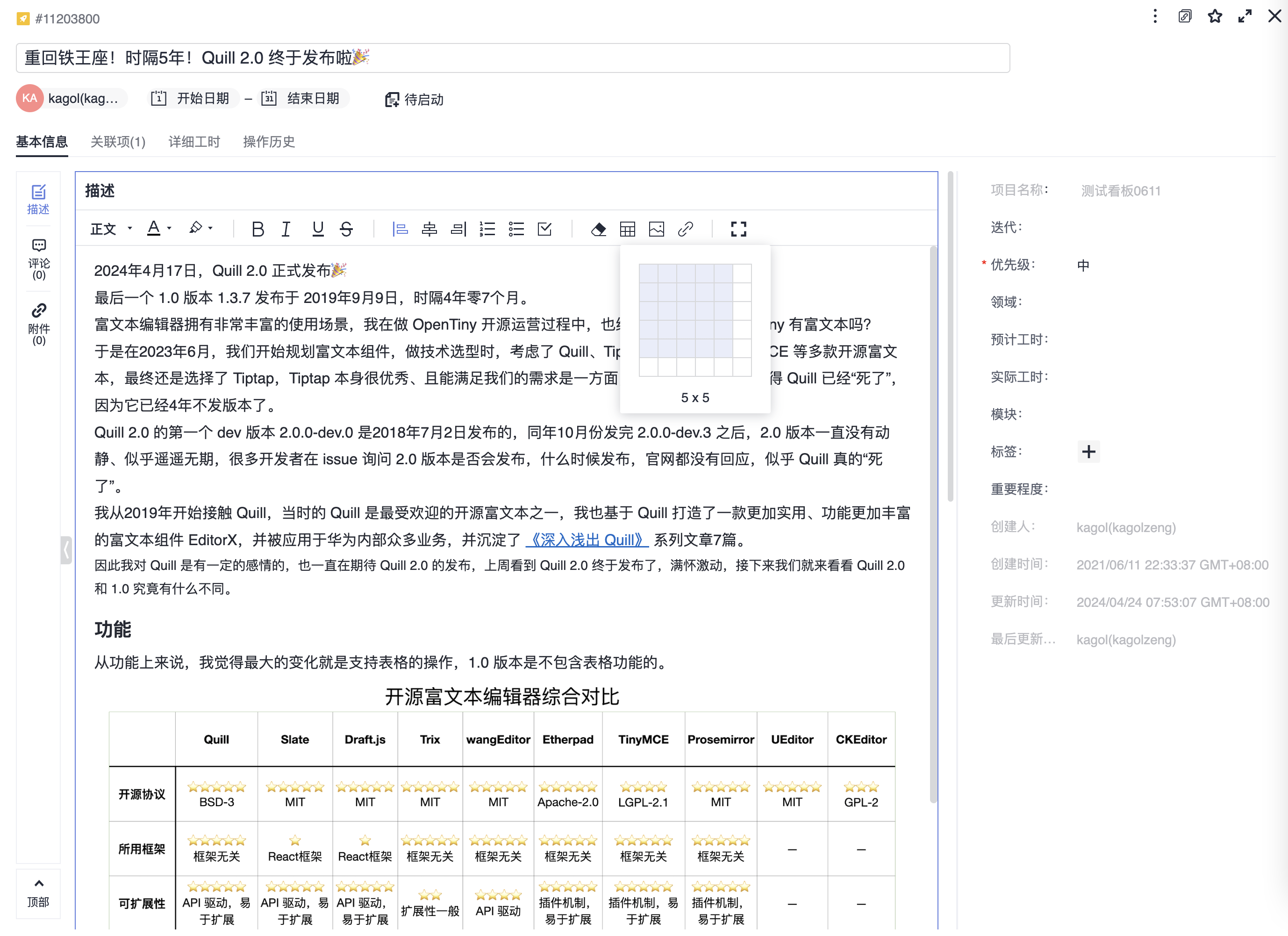 于是在2023年6月,我们开始规划富文本组件,做技术选型时,考虑了 Quill、Tiptap、Editor.js、TinyMCE 等多款开源富文本,最终还是选择了 Tiptap,Tiptap 本身很优秀、且能满足我们的需求是一方面,另一个原因是我们觉得 Quill 已经“死了”,因为它已经4年不发版本了。