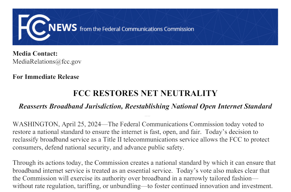 FCC 在一份声明中表示:“通过今天的行动,委员会制定了一项国家标准,确保宽带互联网服务被视为一项基本服务。今天的投票还明确表明,委员会将以一种严格定制的方式行使其对宽带的权力——没有费率监管、关税或分拆——以促进持续的创新和投资。”