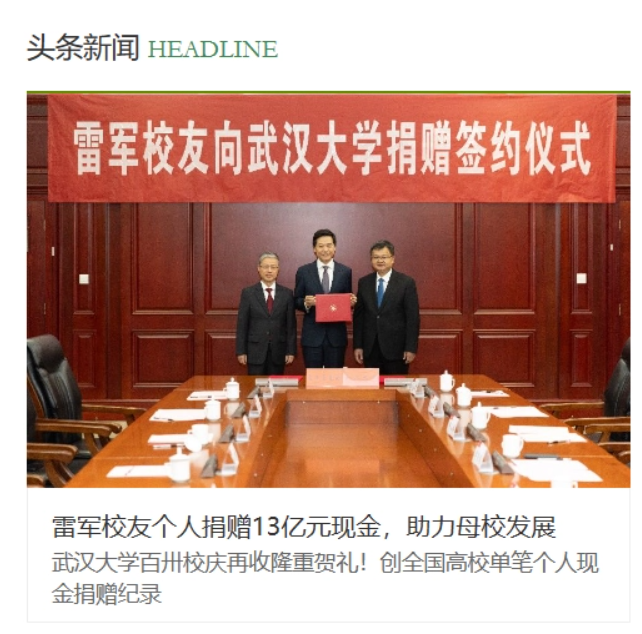 2023 年 11 月 29 日上午,武汉大学 1987 级计算机系校友,小米集团创始人、董事长兼首席执行官雷军向母校捐赠 13 亿元人民币。雷军当时表示,此次捐赠主要聚焦三个方向:支持数理化文史哲六大学科基础研究、支持计算机领域科技创新、支持大学生培养。